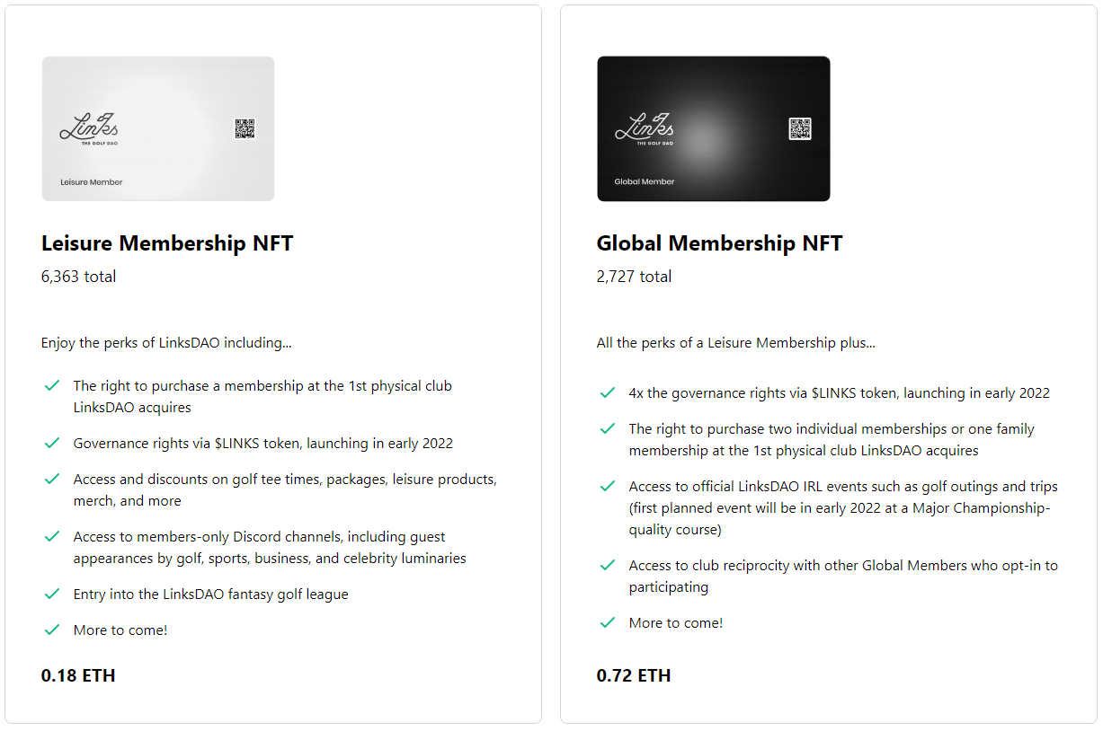 We're gonna buy a golf course! Last December, two buddies came up with the idea to use a DAO (decentralized autonomous organization) to raise funds to "acquire and operate a prominent golf course." Three weeks later and LinksDAO has raised $11 million dollars via an NFT sale that will fund the hiring of a "chief DAO officer", legal counsel, product teams, developers, etc. While ownership of the NFTs does not grant you ownership of the course itself, they do provide you with governance rights in the DAO via the $LINKS token. The team plans to identify a course to purchase early this year, with the potential for additional fundraising being required. Descriptions of the two NFTs and associated perks are below.