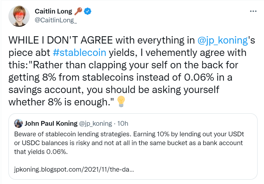 In the below tweet, Caitlin Long, founder of Avanti Bank and former Morgan Stanley Managing Director, questions the risk-reward tradeoff provided by stablecoin lending. The article referenced below can be found here and goes in depth on risks associated with stablecoins like business collapse, asset runs, hacks, and/or tech failure. I highly recommend giving Caitlin a follow if you don't already.