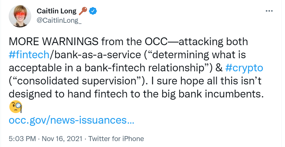 Regulation, regulation, regulation. The head of the Office of the Comptroller of the Currency (OCC) announced that several federal agencies will be releasing a joint statement covering the results of their "crypto sprint." The "sprint", to use their terminology, was a review of how financial regulators can better facilitate digital currencies and it aims to provide clarification that "safety and soundness" are paramount. Some in the industry, including Caitlin Long, are concerned that these regulatory efforts will hand an unfair advantage to existing banks and may even be designed to do so.